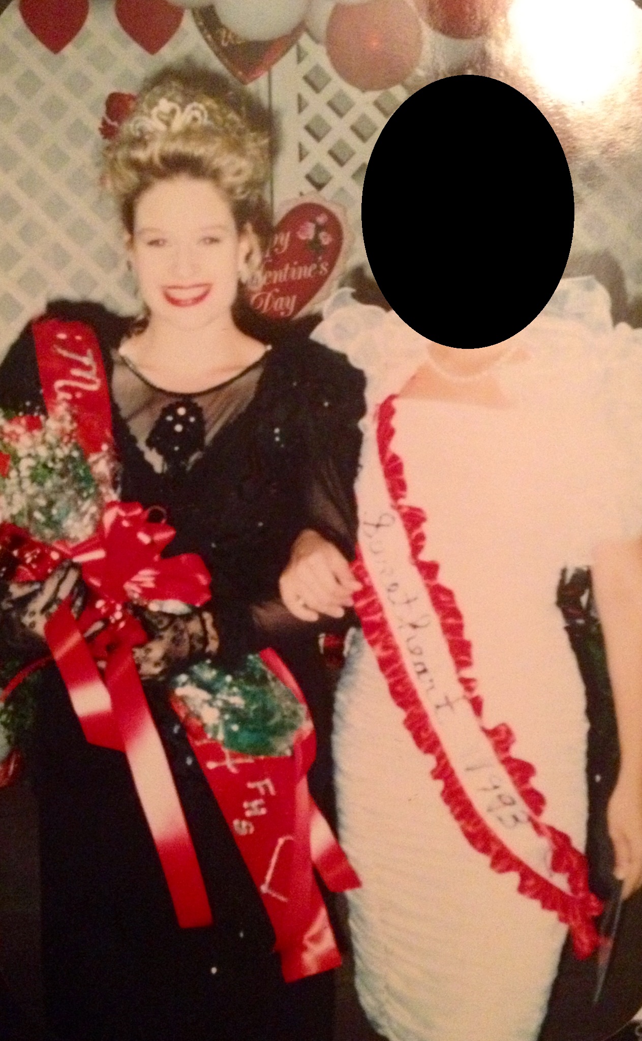For so many young women hatred of one’s body sets in during high school, but I was ‘advanced,’ having started to cultivate my body image issues from age seven, I had already perfected my body preoccupation by middle school; as a result, I didn’t hate my body in high school. However, still lacking confidence and a sense of self-worth, I began to develop and perfect the art of “Smile. Suck in. Am I sucking in? Suck in some more.” I never felt like I looked good enough. Even in sophomore year when I was crowned Miss Sweetheart, all I could think about while the pictures were being taken was “suck in…god, please don’t snap on an exhale.” That night a gym full of people saw a smiling beauty queen, when really that beauty queen- me- I was dying inside- self-conscious and at war.